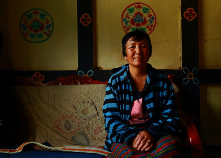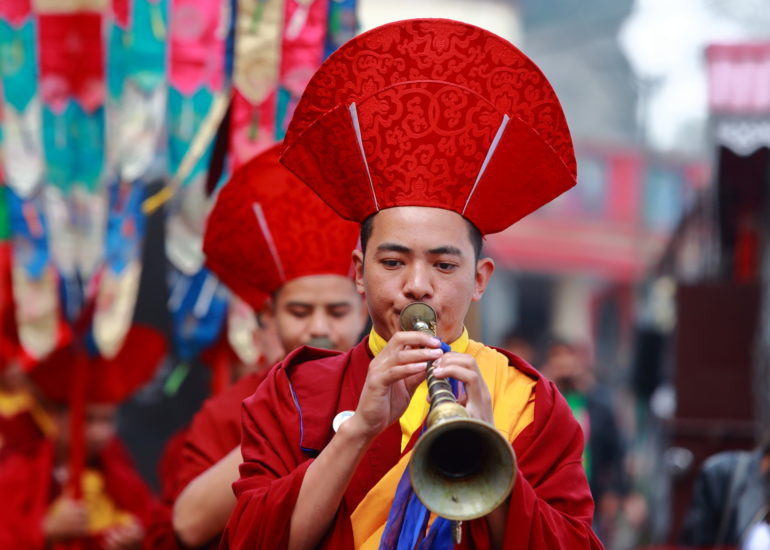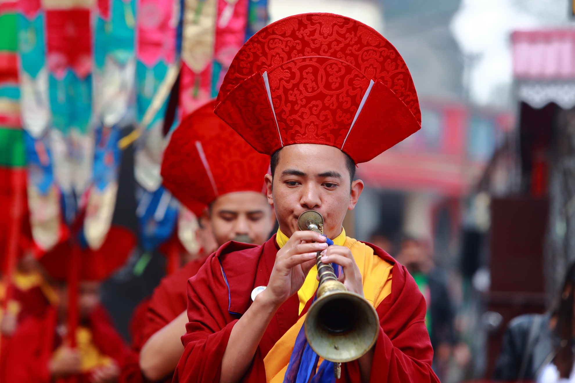 bhutan-10 Buddhist monks play music on trumpets during the praying ceremony